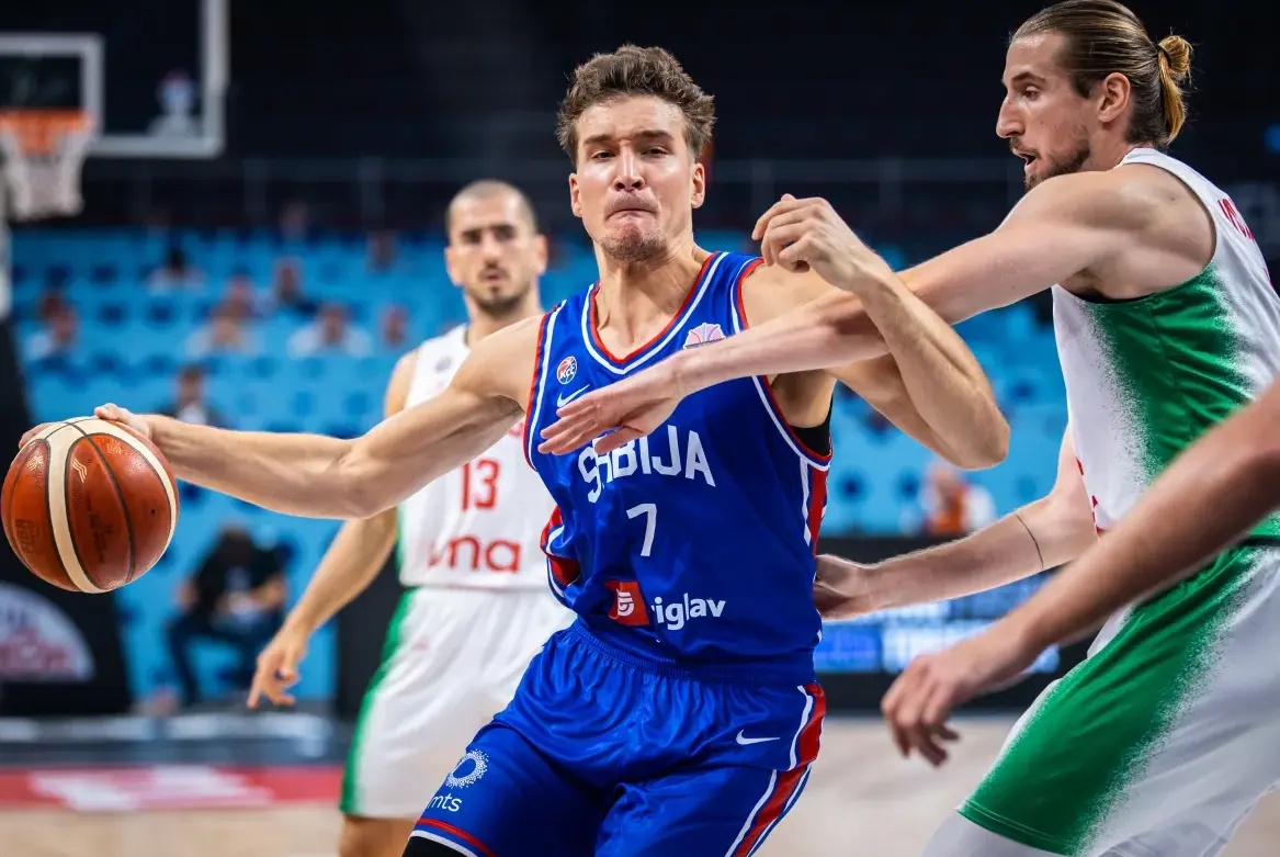 2025年男篮欧洲杯,博格丹仅仅出战2场比赛,场均出战20.1分钟可以拿下9分3.5篮板4助攻1抢断,投篮命中率77.8%,三分命中率50%,罚球命中率100%;博格丹腿筋撕裂导致欧洲杯报销,这是对志在夺冠的塞尔维亚的一大重创。